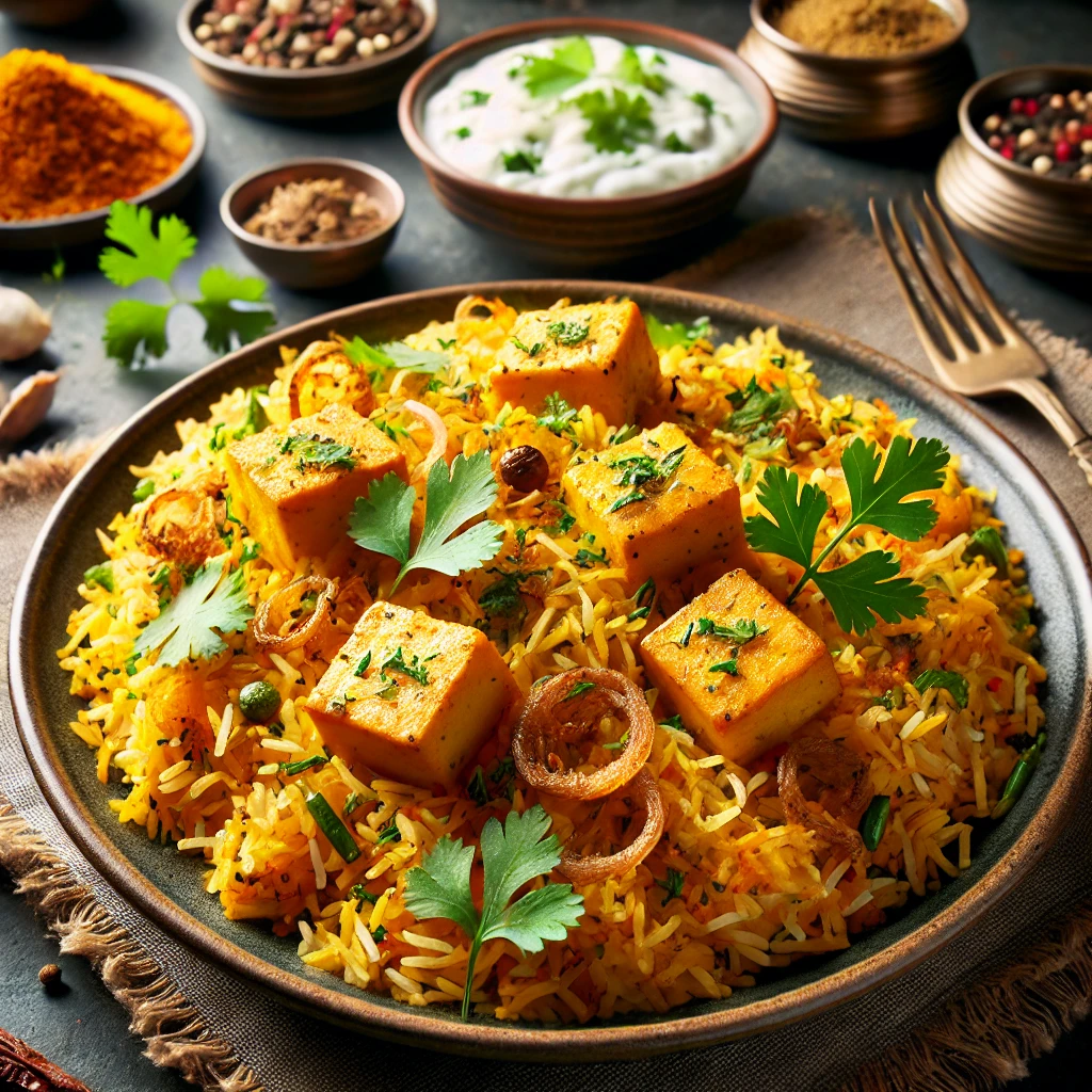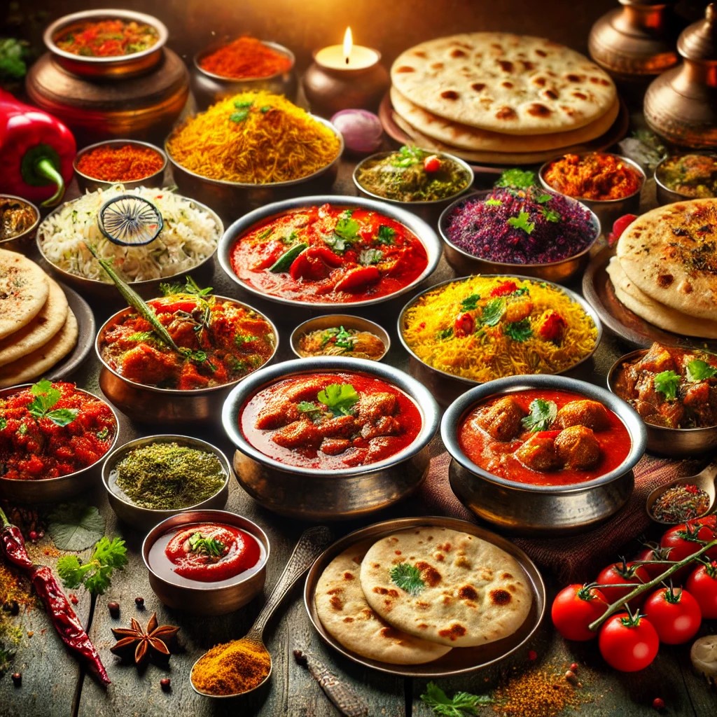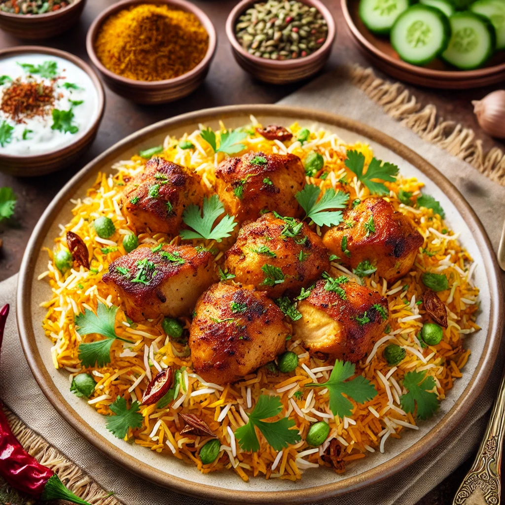 A wholesome Chicken Thali featuring Chicken Tikka Masala, Saag Chicken, Veg Handi, Tadka Dal, steamed rice, soft naan, refreshing raita, crispy papad, and a sweet Gulab Jamun for dessert. A complete meal that offers a delightful variety of flavors!